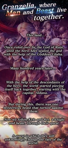 The tale of the bond between Man and Beast. A world where humans and beasts coexist, Granzelia. The war started by the God of Ruin has passed and humanity is now living in peace. However, things start to change when the 12th Division of the Knight Brigade was given a mission to rescue a young woman. Kyle, a young hot-blooded knight, and Rei, a fearless beast boarded a skyship of the Empire. What they didn't know was... Their choices would change the world. |